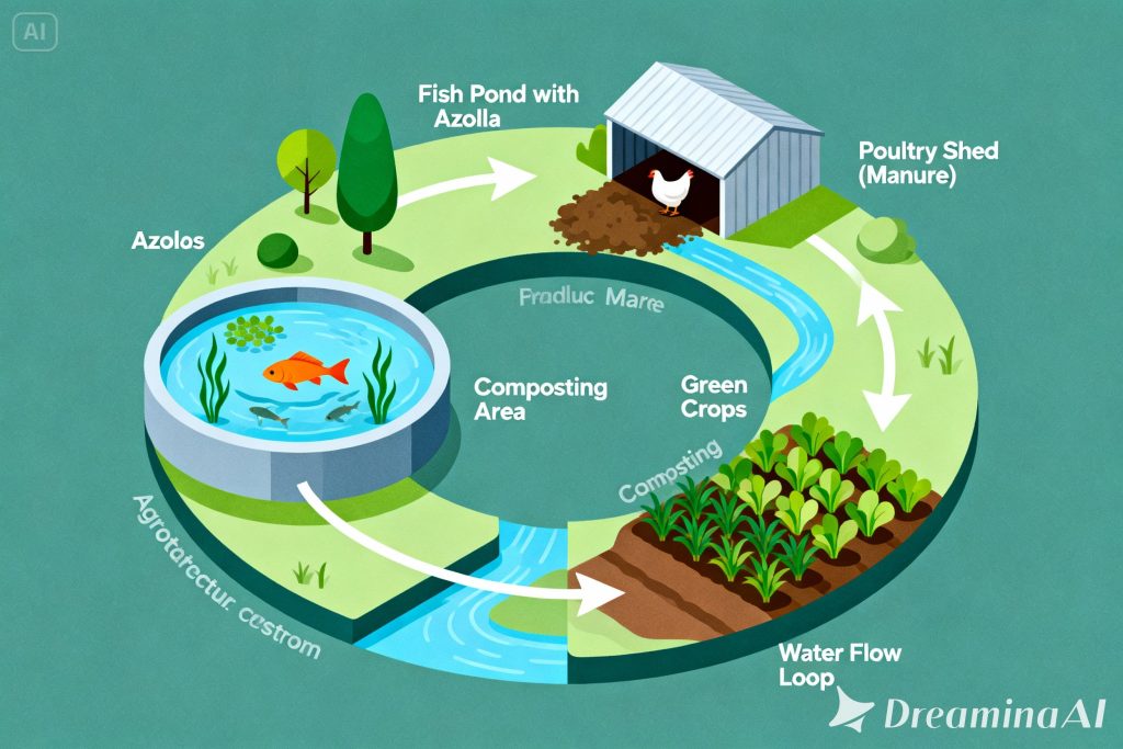 Setiap komponen bukan berdiri sendiri, tetapi saling memberi. Air kolam memberi pupuk ke tanaman. Tanaman memberi pakan ke unggas. Unggas memberi kotoran ke kompos. Kompos menghidupkan tanah. Tanah menghasilkan hijauan. Hijauan kembali memberi makan unggas dan ikan.