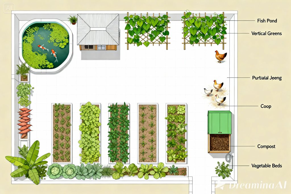 Untuk lahan 250–500 m², mulai bisa diterapkan modul lebih lengkap: kolam seri, kebun rambat, kandang intensif, area tumpangsari, serta sistem air berlapis.