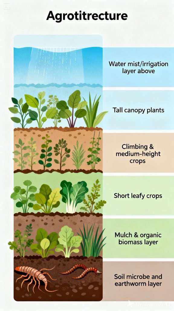 Agrotecture melihat lahan secara vertikal. Ada enam layer yang bekerja: